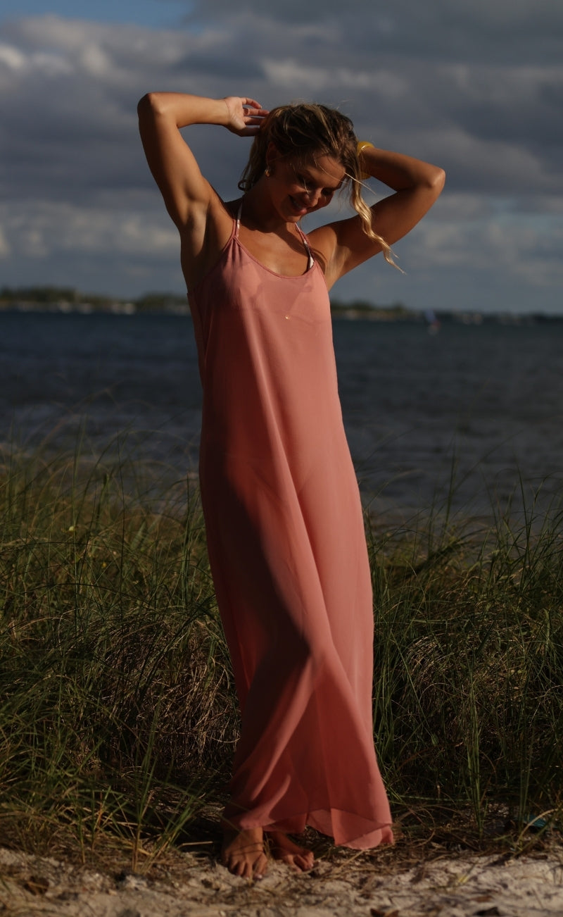 Vestido rosa largo.